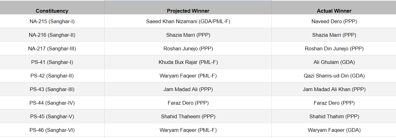The district’s national and provincial seats mostly remain divided between the Pakistan Muslim League-Functional (PML-F) and the Pakistan Peoples Party-Parliamentarian (PPPP).