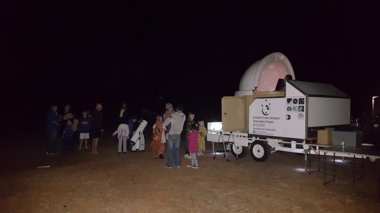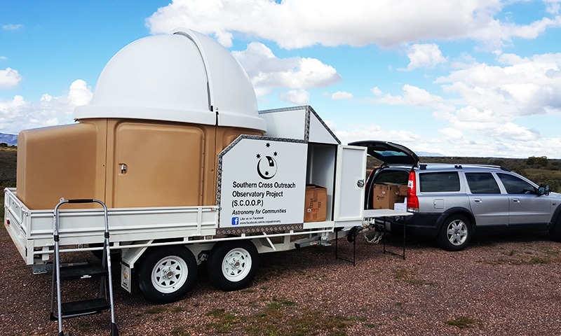 The Southern Cross Outreach Observatory Project (Scoop) is a domed observatory mounted on a trailer and equipped with a computerised telescope. The aim of the observatory is to make astronomy more accessible to distant and remote communities in Australia.